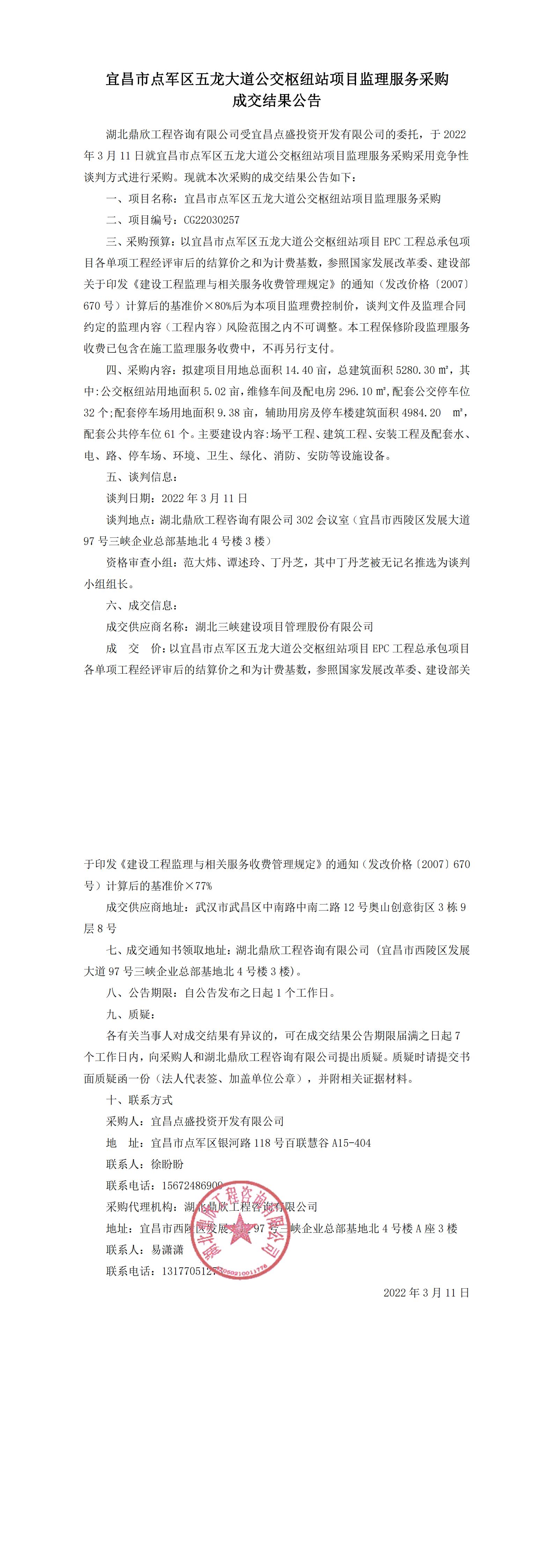 宜昌市點軍區(qū)五龍大道公交樞紐站項目監(jiān)理服務(wù)采購成交結(jié)果公告