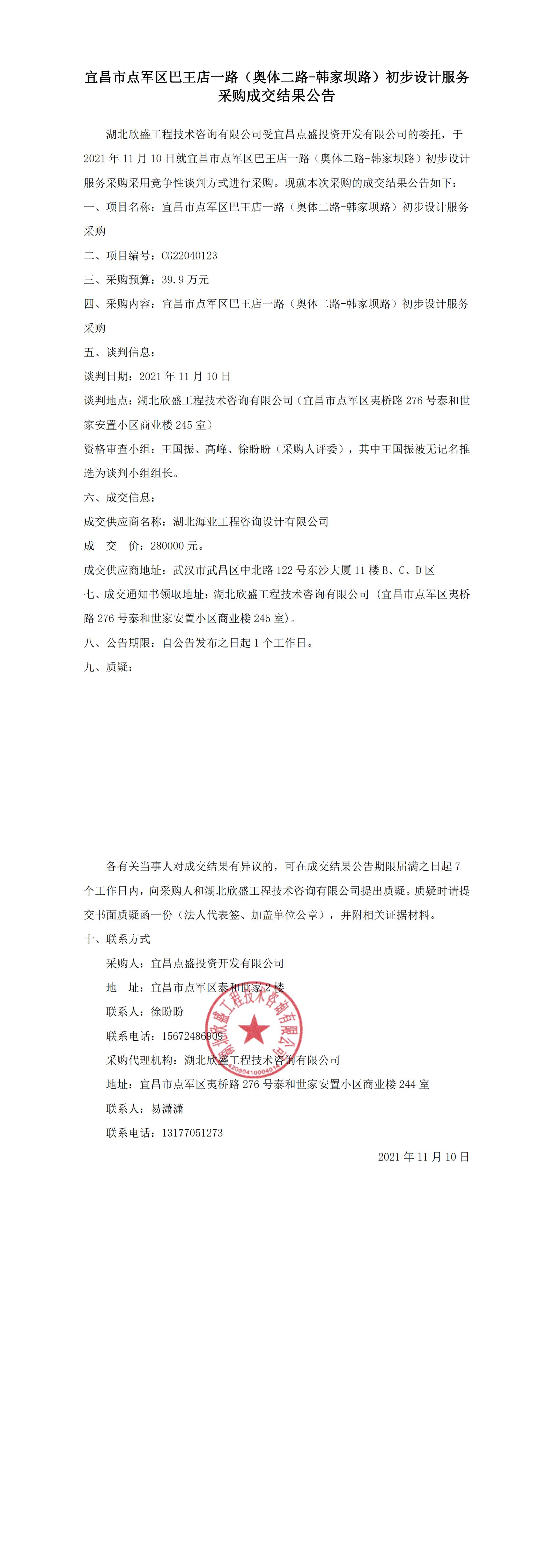 宜昌市點(diǎn)軍區(qū)巴王店一路(奧體二路-韓家壩路)初步設(shè)計(jì)服務(wù)采購(gòu)成交結(jié)果公告
