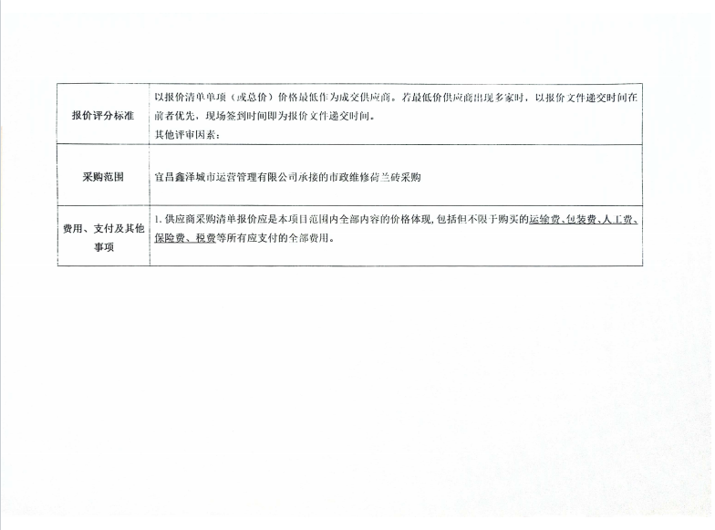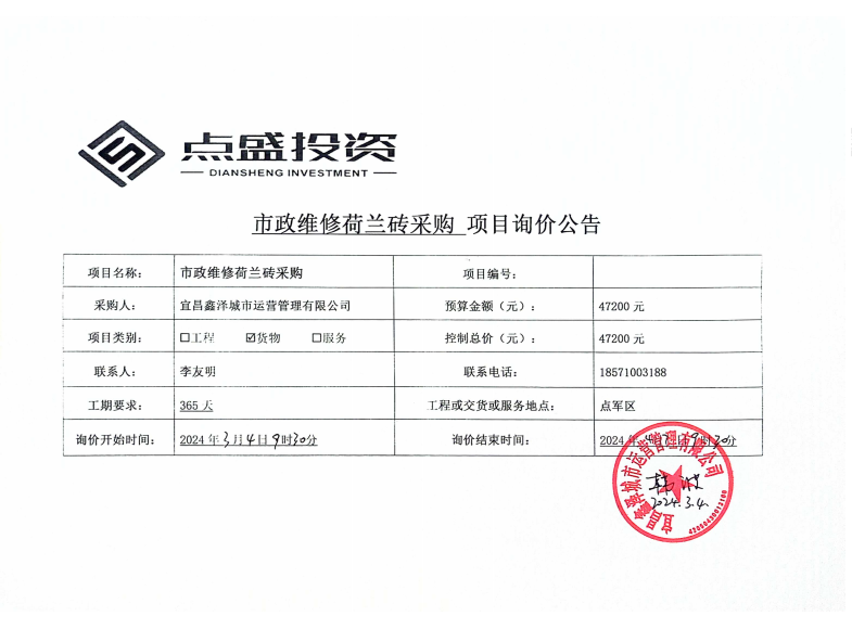 宜昌鑫澤城市運(yùn)營管理有限公司市政維修荷蘭磚采購項(xiàng)目詢價(jià)公告