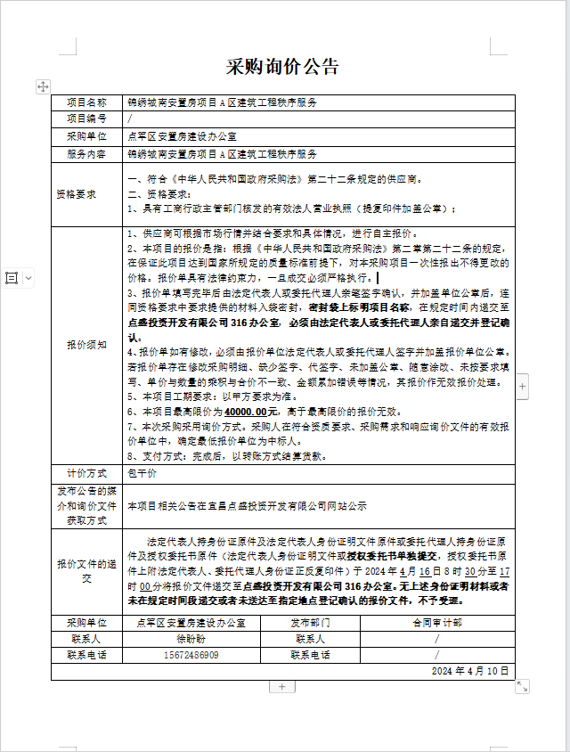 錦繡城南安置房項目A區(qū)建筑工程秩序服務(wù)詢價公告