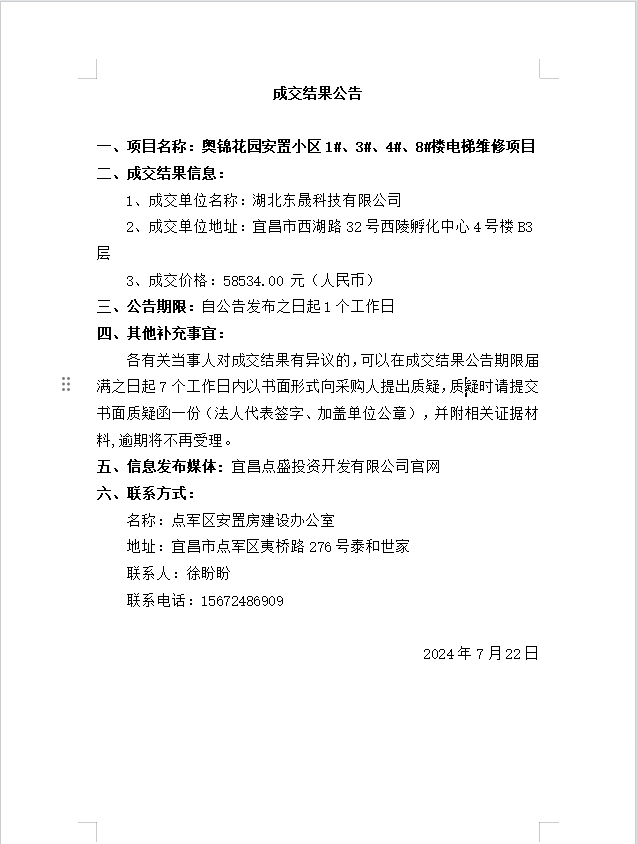 奧錦花園安置小區(qū)1#、3#、4#、8#樓電梯維修項目成交公告