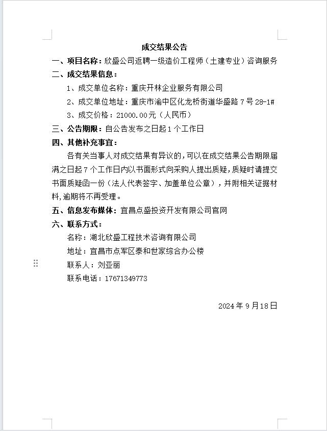 欣盛公司返聘一級造價工程師(土建專業(yè))咨詢服務 成交公告
