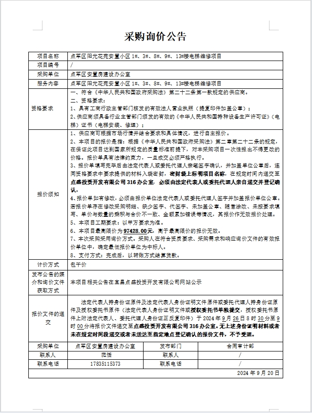 點(diǎn)軍區(qū)陽(yáng)光花苑安置小區(qū)1#、3#、8#、9#、13#樓電梯維修項(xiàng)目詢(xún)價(jià)公告