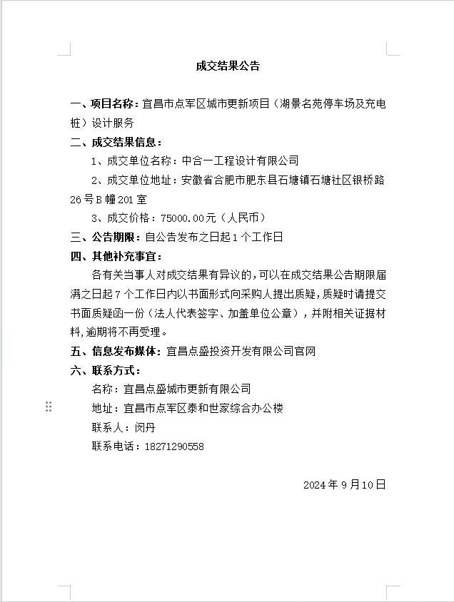 宜昌市點軍區(qū)城市更新項目(湖景名苑停車場及充電樁)設(shè)計服務(wù)成交公告