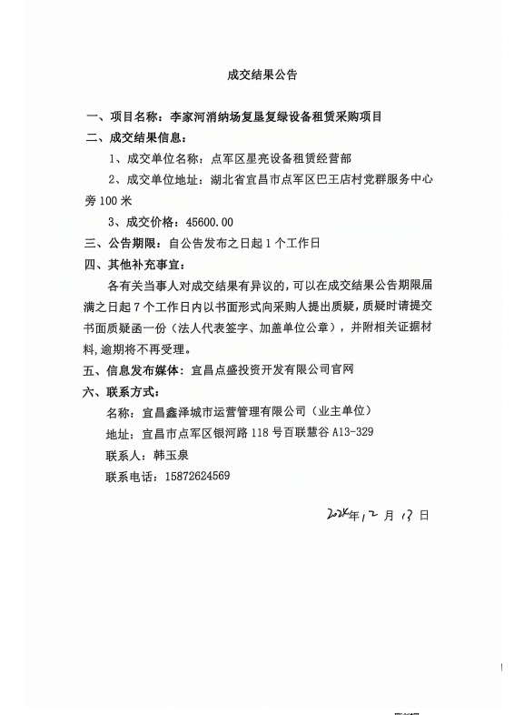 李家河銷鈉場(chǎng)復(fù)墾復(fù)綠設(shè)備租賃采購項(xiàng)目成交公告
