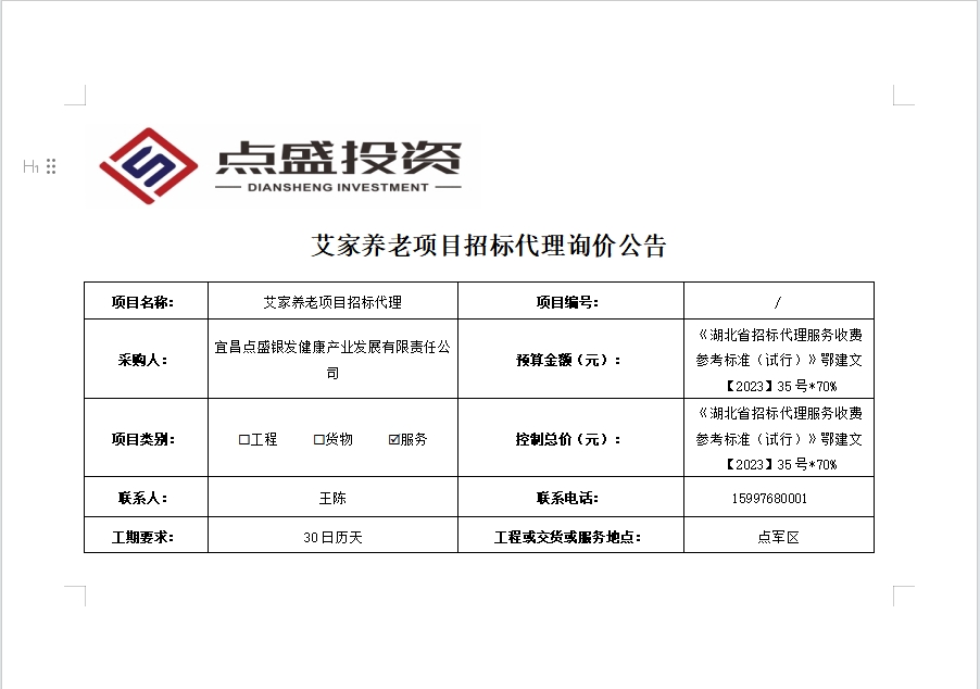 艾家養(yǎng)老項(xiàng)目招標(biāo)代理詢價(jià)公告