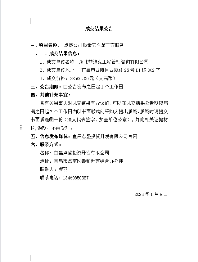 點盛公司質(zhì)量安全第三方服務(wù)成交公告